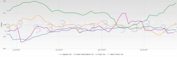 En Colombia y Argentina la situación es muy parecida entre ambos, pues en los últimos años la producción ha aumentado de forma significativa, sin embargo, hoy se encuentran con un mercado que le cuesta seguir mejorando en precio. En las últimas semanas la cotización se mueve de forma volátil y no existe una tendencia que se mantenga. En este mes, una empresa exportadora argentina fue noticia al enviar por primera vez carne de cerdo a Rusia, mientras que Colombia, a través de su asociación gremial de porcicultores, estuvo en Asia en una gira comercial promoviendo su carne de cerdo. Una vez que ambos países comiencen la senda exportadora, sus mercados tendrán la energía necesaria para que se mejoren los precios, tal y como lo estamos viendo con Chile y México.